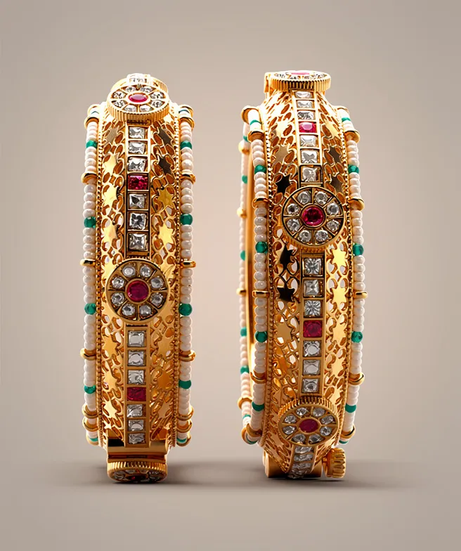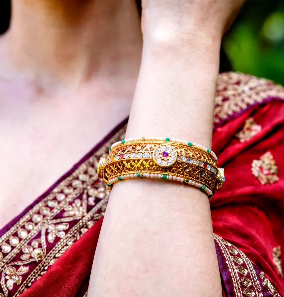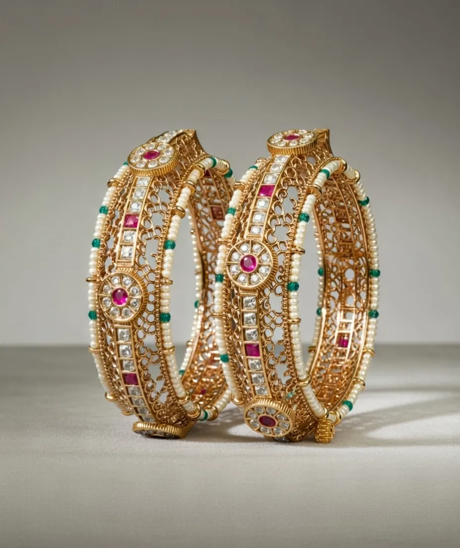 Traditional antique gold bangles adorned with Kundan, pearls, and intricate filigree — perfect for weddings, festivals, and classical occasions.