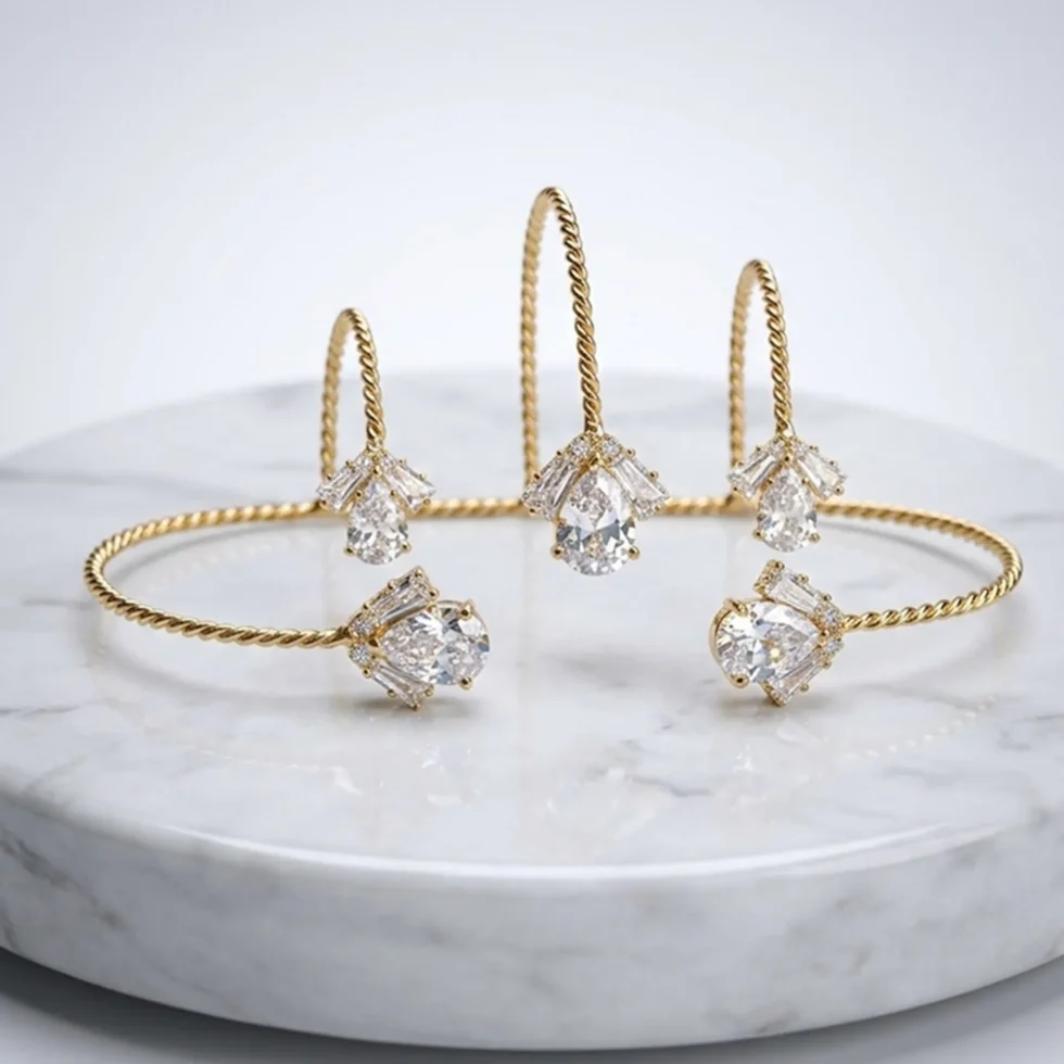 A sleek golden twisted bracelet featuring dazzling diamond-cut stones — perfect for weddings, cocktail parties, and festive wear.